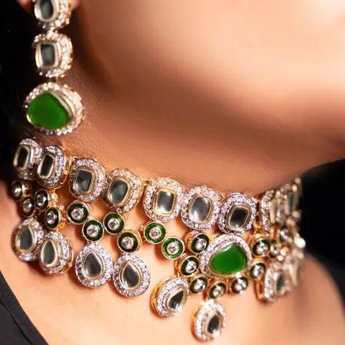 A luxurious kundan bridal jewelry set featuring radiant  stones paired with shimmering white kundan, designed to add timeless elegance to your wedding or festive look.