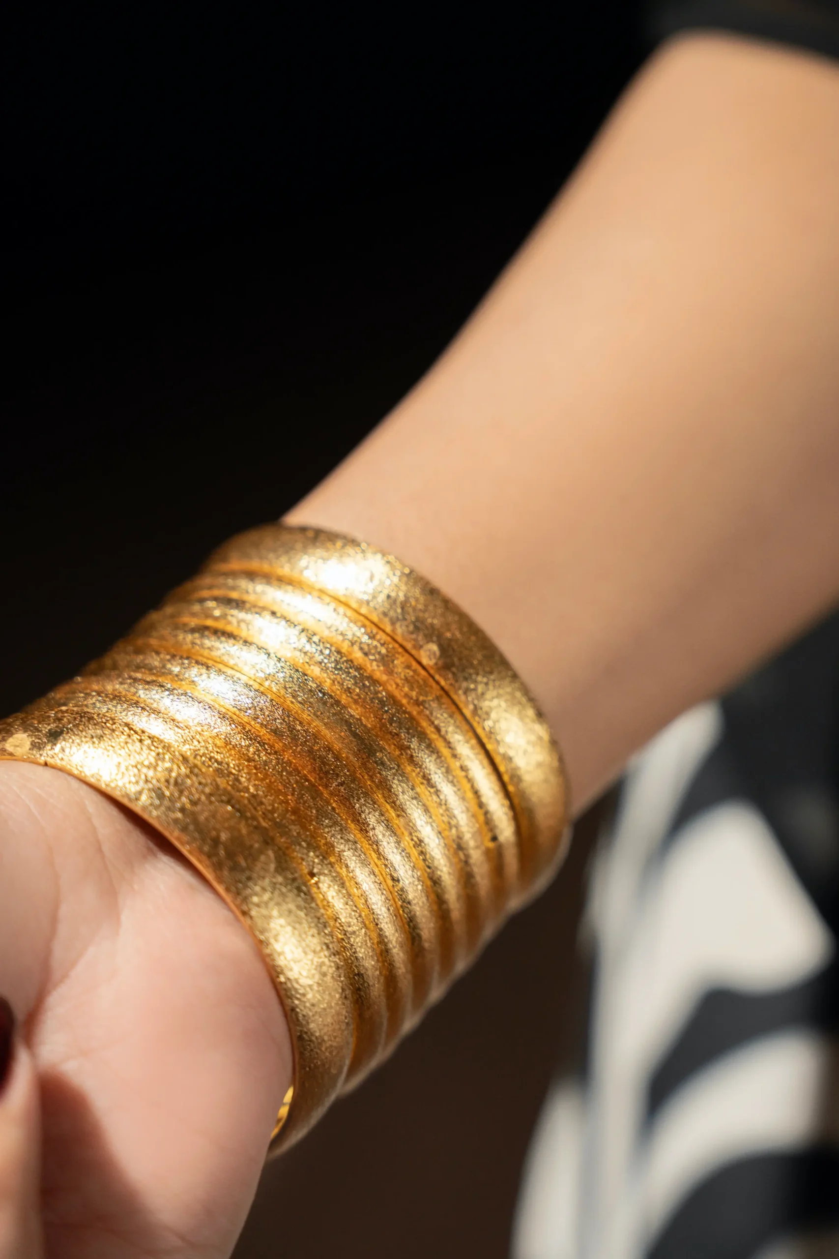 These elegant textured golden karay are crafted to bring out sophistication and style in every detail. Their smooth yet slightly textured surface gives a rich, radiant glow that complements traditional attire as well as modern outfits. Lightweight yet striking, this set can be worn daily for a subtle touch of grace or styled with festive wear for a bold statement. Whether worn alone or stacked together, these karay are designed to enhance your look with effortless elegance.