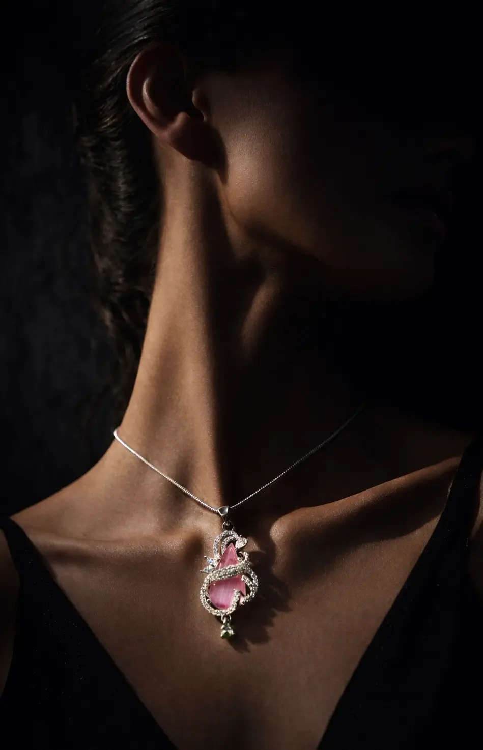 The Diamond Blush Pendant Set is a celebration of soft glamour and graceful design. Featuring a beautifully crafted blush-pink crystal centerpiece, this set is enhanced with shimmering crystal embellishments arranged in an artistic swirl pattern that adds depth and sophistication.