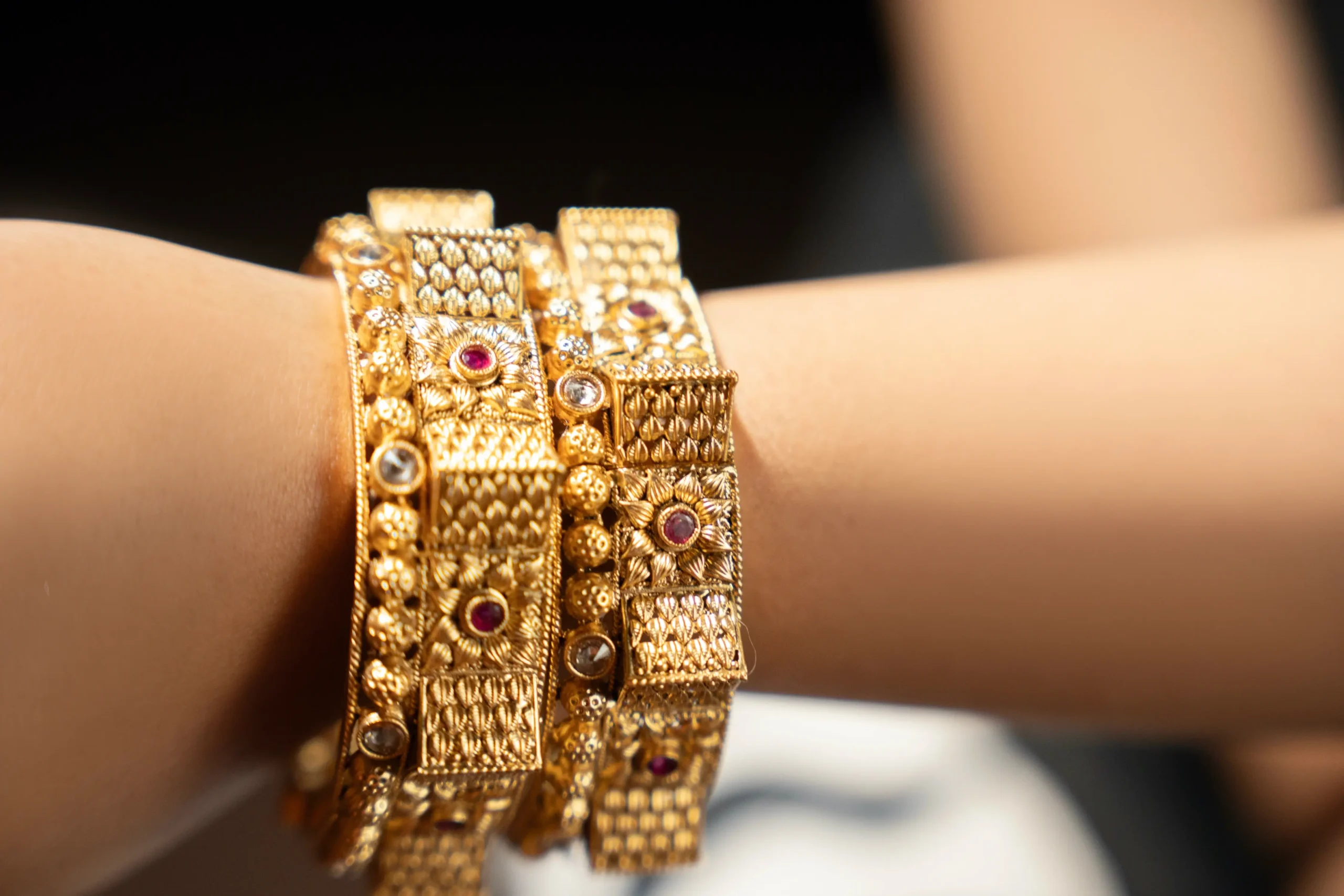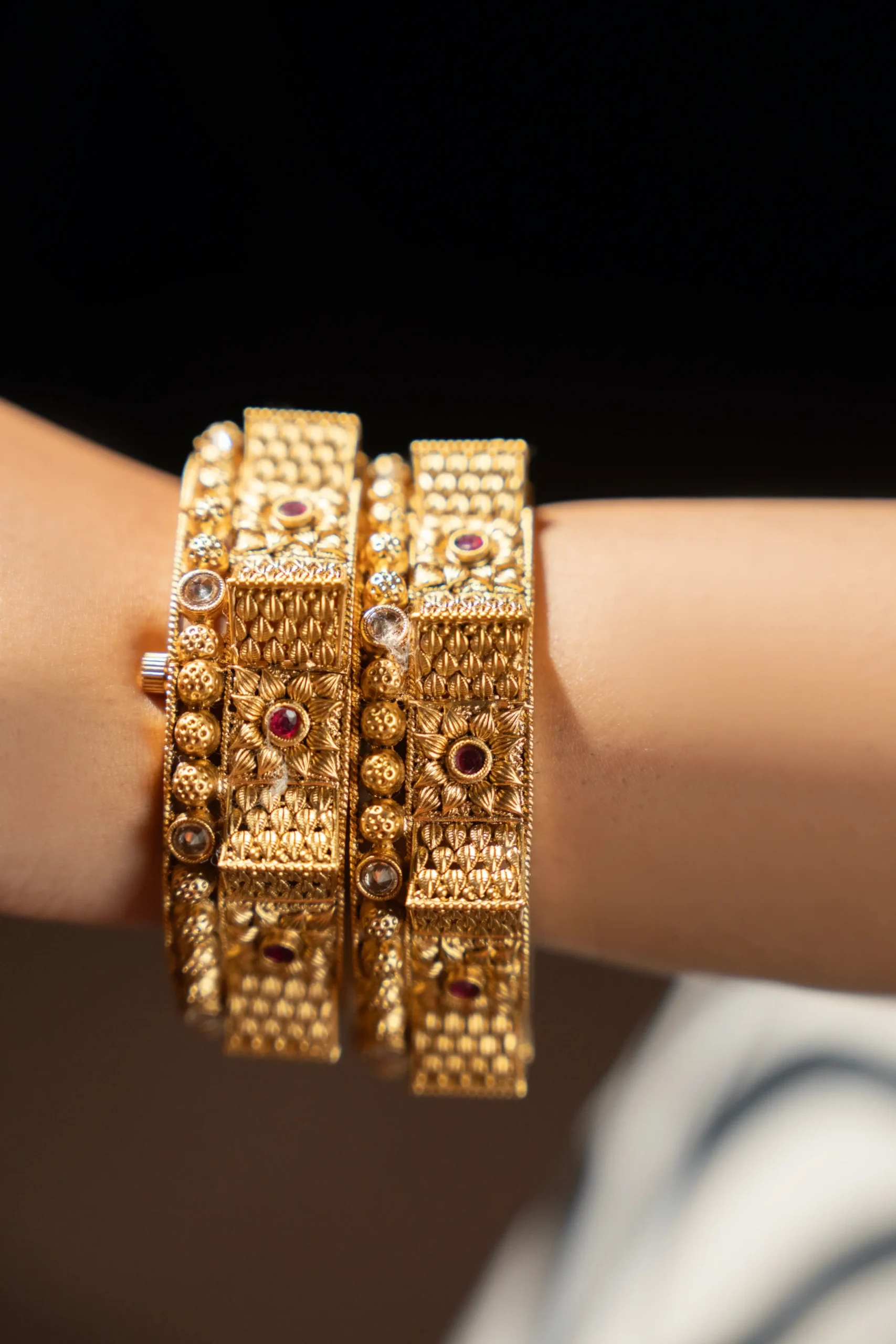 These Rajwadi gold bangles showcase the timeless artistry of traditional Indian craftsmanship. Designed with detailed  work and adorned with rich ruby stones, they reflect royalty and heritage in every curve. The intricate motifs and textured patterns make them an ideal choice for weddings, festive celebrations.