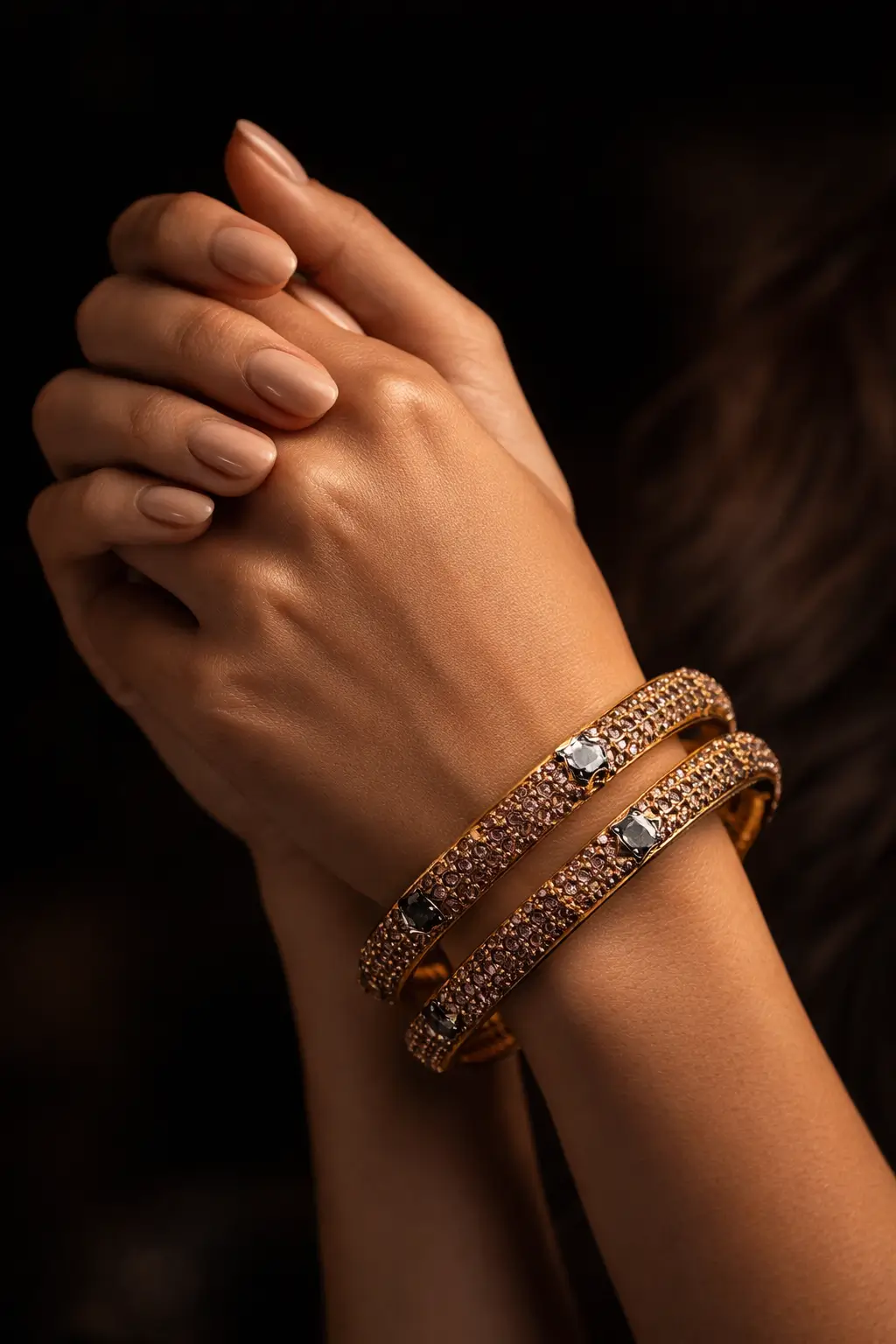 These exquisite gold bangles bring together modern sophistication and timeless elegance. Studded with sparkling purple stones and accented with bold black details, they create a striking contrast that elevates any outfit. Ideal for festive celebrations, weddings, or evening parties, these bangles add a graceful yet glamorous touch.